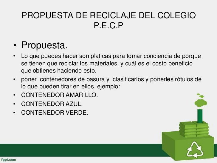- 4. PROPUESTA DE RECICLAJE DEL COLEGIO P.E.C.P• Propuesta.• Lo que puedes hacer son platicas para tomar conciencia de porque se tienen que reciclar los materiales, y cuál es el costo beneficio que obtienes haciendo esto.• poner contenedores de basura y clasificarlos y ponerles rótulos de lo que pueden tirar en ellos, ejemplo:• CONTENEDOR AMARILLO.• CONTENEDOR AZUL.• CONTENEDOR VERDE.