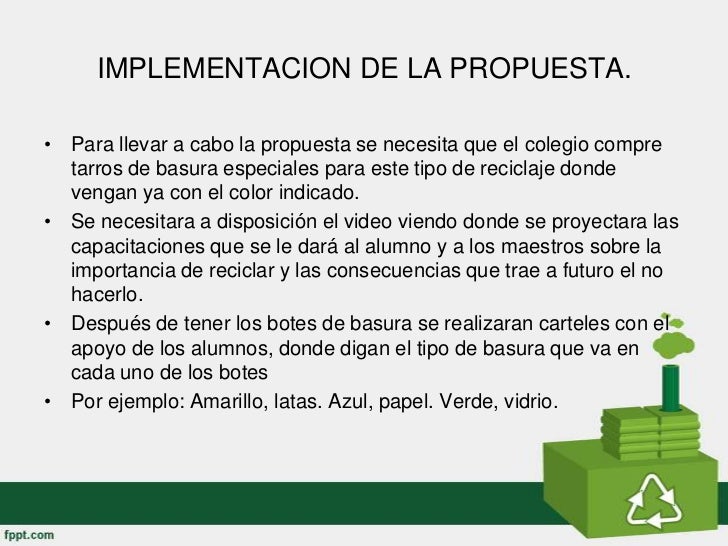 - 5. IMPLEMENTACION DE LA PROPUESTA.• Para llevar a cabo la propuesta se necesita que el colegio compre tarros de basura especiales para este tipo de reciclaje donde vengan ya con el color indicado.• Se necesitara a disposición el video viendo donde se proyectara las capacitaciones que se le dará al alumno y a los maestros sobre la importancia de reciclar y las consecuencias que trae a futuro el no hacerlo.• Después de tener los botes de basura se realizaran carteles con el apoyo de los alumnos, donde digan el tipo de basura que va en cada uno de los botes• Por ejemplo: Amarillo, latas. Azul, papel. Verde, vidrio.