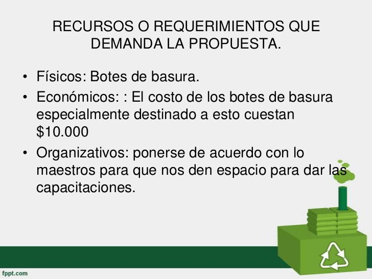 - 6. RECURSOS O REQUERIMIENTOS QUE DEMANDA LA PROPUESTA.• Físicos: Botes de basura.• Económicos: : El costo de los botes de basura especialmente destinado a esto cuestan $10.000• Organizativos: ponerse de acuerdo con lo maestros para que nos den espacio para dar las capacitaciones.